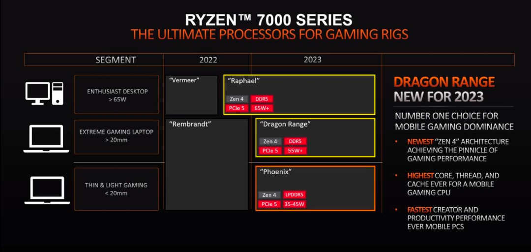近日,AMD公布了锐龙 7000 处理器的最新路线图,桌面系列将在今年下半年发布,移动系列将在明年初发布,AMD 锐龙 7000 系列移动处理器将在 2023 年上市。近几代的 AMD 游戏本处理器和轻薄本处理器基本上规格相同,差距在于功耗,这一情况似乎将在锐龙 7000 上有所改变。