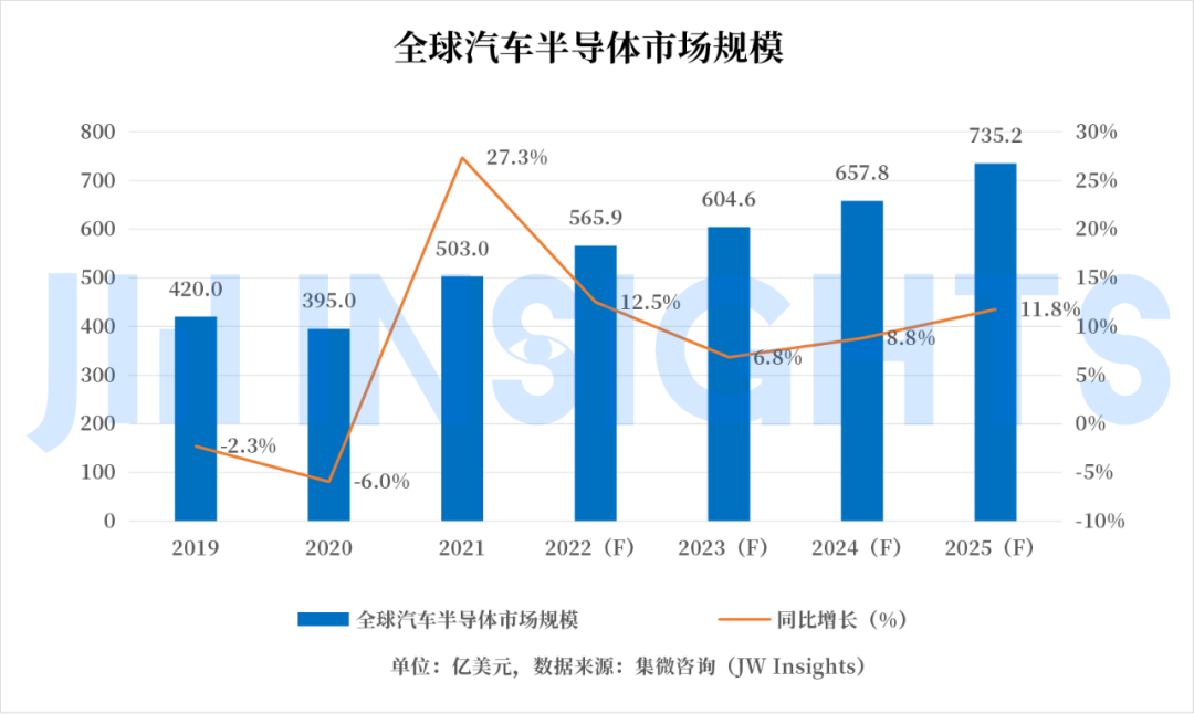 集微咨询(JW Insights)的数据显示,2021年到2025年,全球汽车半导体市场规模将以10%的CAGR增长;到2025年,全球汽车半导体将达到735.2亿美元的市场规模。