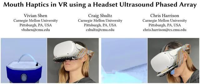 最近,卡内基梅隆大学的研究者开发出搭载在Meta Quest 2头显上的硬件模块,能让用户在VR中体验喝水、刷牙和亲吻的触感。设备的工作原理是用新增模块中的轻薄超声波换能器,将超声波脉冲瞄准在用户口腔内部和周围的位置,通过用高能的超声波脉冲轰击微小颗粒,使其悬浮和移动。如此一来,它们在用户张开嘴时,就能在他们的嘴唇、牙齿、甚至舌头上创造出触摸的感觉。