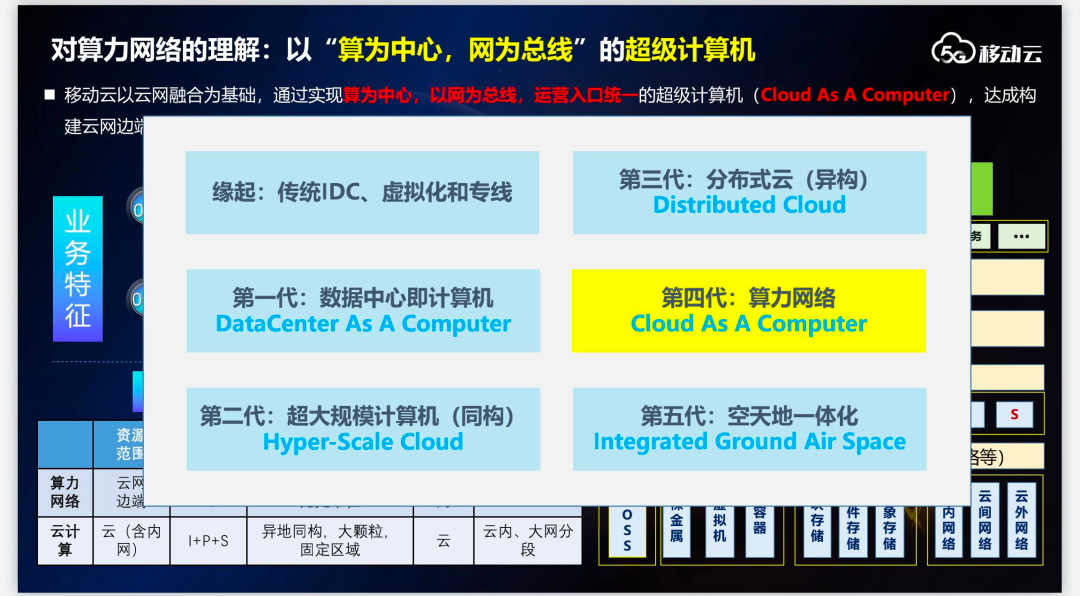 移动算力网络的发展路径:第一个阶段是泛在协同(2021-2023年),虽然算力和网络还是各自分配,但算网的能力可以被协同调动,第二个阶段是融合统一(2023-2024年),形成融合统一的算力网络服务,智能编排能力也已经构建,第三个阶段是一体内生(2025年+),整个算力网络形成融合一体化的服务能力,可以面向不同对象,提供各种可组合的新型业务能力。