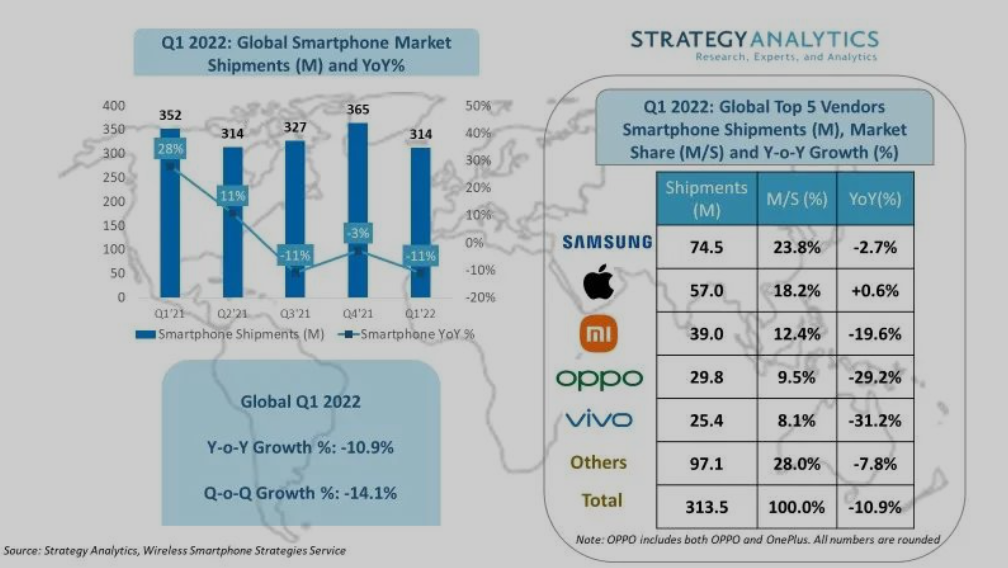 Strategy Analytics最新研究指出,2022年Q1全球智能手机出货量同比下降11%,至3.14亿部。三星在该季度以24%的市场份额高居全球智能手机市场榜首,这是其近5年来Q1表现最好的一次。苹果以18%的市场份额位居第二;小米、OPPO(包括一加)和vivo保持在前五名。