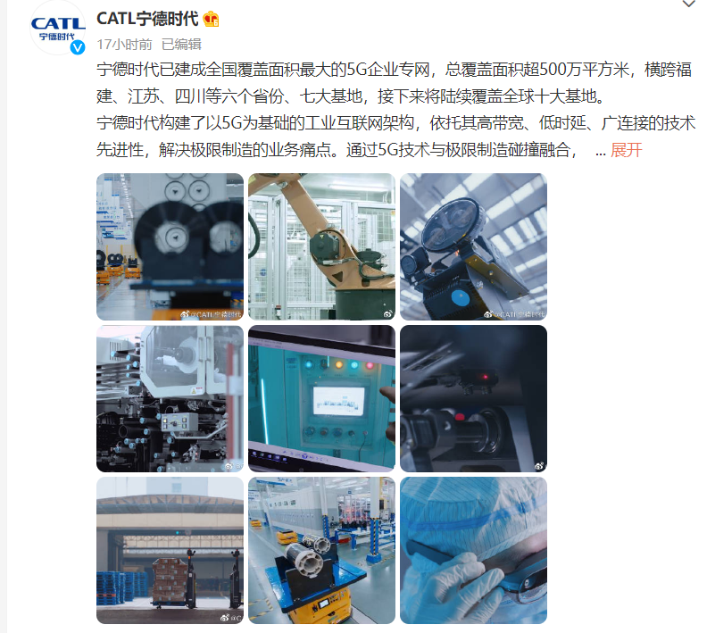 近日,国内新能源企业宁德时代在官方微博宣布,已经建成全国覆盖面积最大的5G企业专网,其规模超过500万平方米,约等于11904个标准篮球场。据悉,这一5G企业专网横跨福建、江苏、四川等六个省份的共计七大基地,还在持续扩展中,将陆续覆盖位于全球的十大基地。宁德时代表示,这套以5G为基础的工业互联网架构,能够充分利用其高带宽、低时延、广连接的技术先进性,有效解决了极限生产环境中,存在的多个业务痛点。