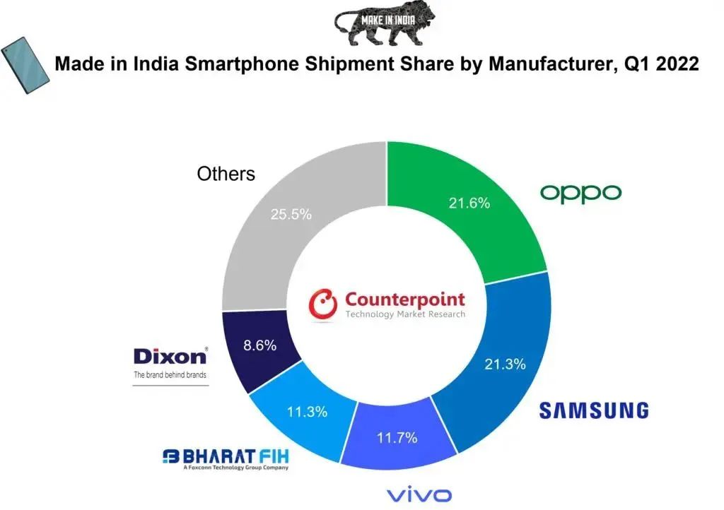 据Counterpoint最新研究,“印度制造”智能手机出货量在2022年第一季度同比增长 7%,达到4800多万部。印度的智能手机制造业正在增长。2021年,“印度制造”智能手机的出货量超1.9亿部。印度智能手机需求的增加以及出口的增加是持续增长的主要原因。