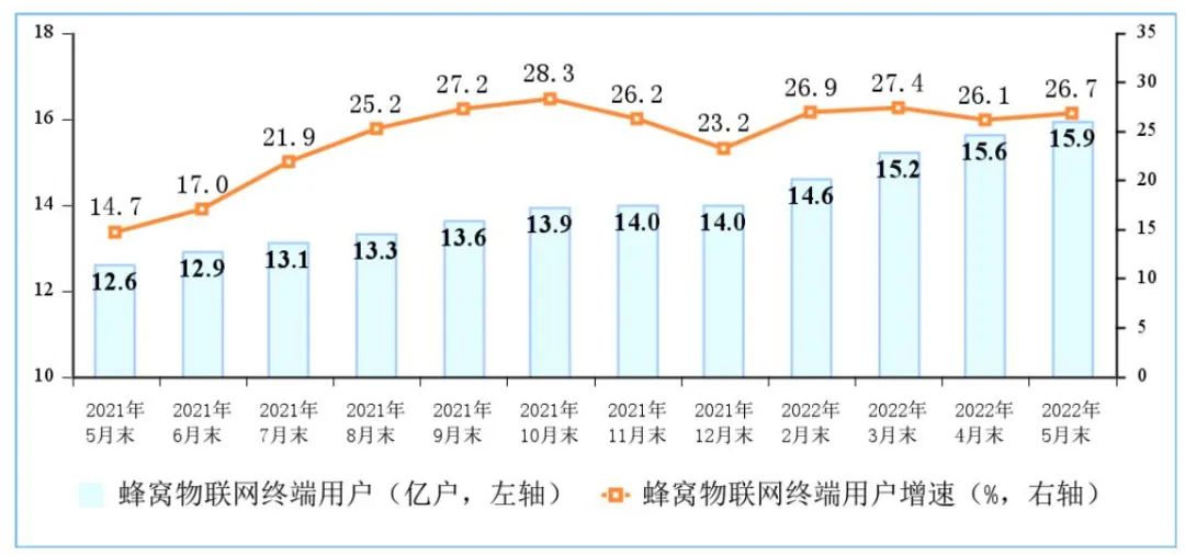 工信部数据显示,截至5月末,三家基础电信企业发展蜂窝物联网终端用户15.9亿户,比上年末净增1.96亿户。蜂窝物联网终端用户规模快速接近移动电话用户,两者规模差缩小至6751万户,占移动网终端连接数(包括移动电话用户和蜂窝物联网终端用户)的比重已达49%。IPTV(网络电视)总用户数达3.64亿户,比上年末净增1540万户。