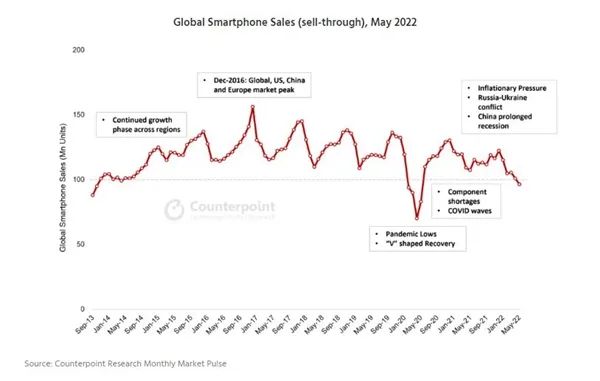 近10年来,全球智能手机销量第二次跌破1亿。根据Counterpoint Research最新数据显示,2022年5月,全球智能手机市场销量环比下降4%,同比下降10%,至9600万部。这是全球智能手机市场环比销量连续第二个月下滑,也是同比销量连续第11个月下滑。