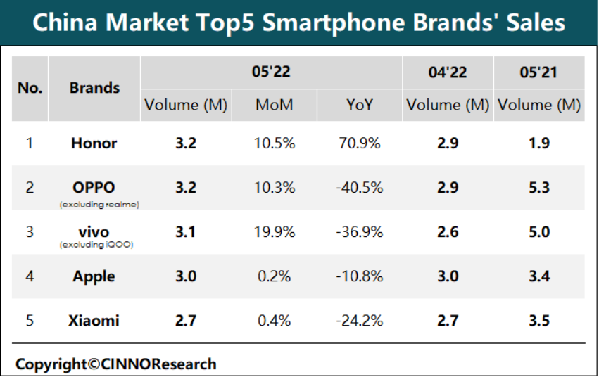 ■ CINNO:5月国内智能机销量环比增8.6%,荣耀、OPPO排前二