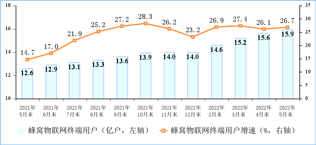 根据工信部发布的《2022年1-5月份通信业经济运行情况》,截止5月底,我国蜂窝物联网用户已达15.9亿户,相比去年底净增1.96亿户。而移动电话用户总数为16.6亿户,相比去年底净增1966万户。据最新统计数据显示,二者差距缩小至6751万户,占比分别为49%和51%。