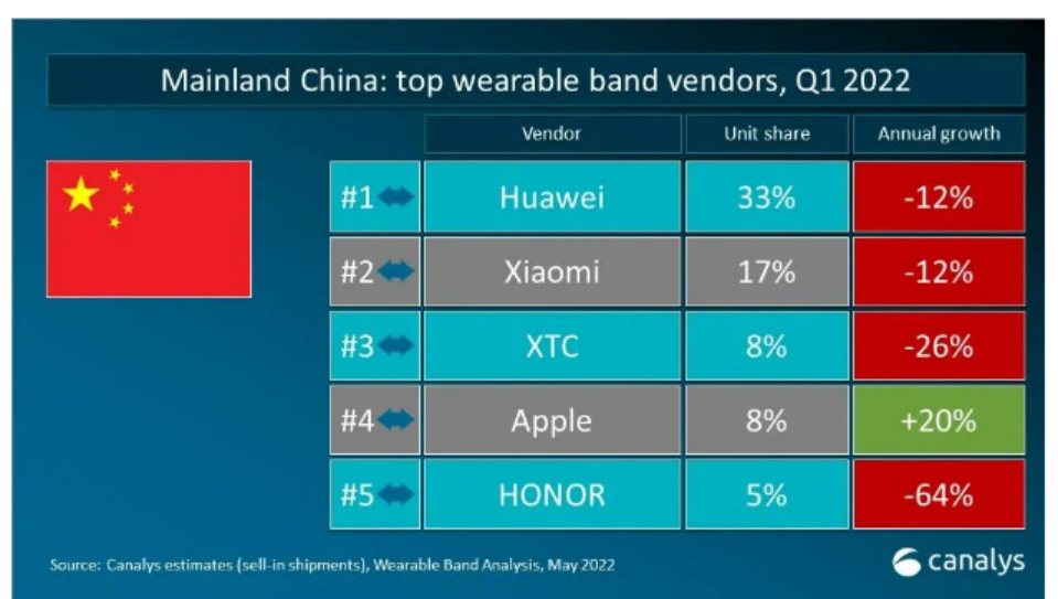 Canalys数据显示,2022 年第一季度,全球可穿戴腕带设备出货量下降 4%,跌至 4170 万部。从地区来看,2022年第一季度中国大陆可穿戴腕带设备市场排名前五位的厂商分别是华为、小米、小天才(XTC)、苹果、荣耀,市场份额分别为33%、17%、8%、8%、5%。