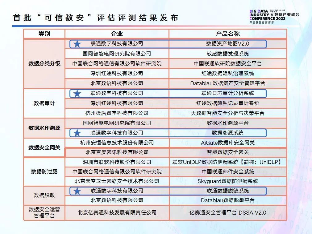 中国信通院云计算与大数据研究所在2022大数据产业峰会上发布“可信数安”首批评测结果,共有11家企业的19款产品获得殊荣。