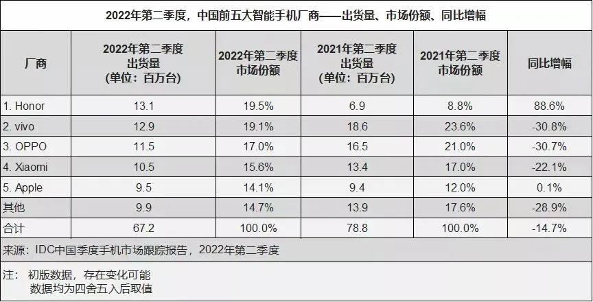 市场研究机构IDC发布的报告数据显示,2022年第二季度,中国智能手机市场出货量约6720万台,同比下降14.7%。上半年国内智能机市场出货量约1.4亿台,同比下降14.4%。2022年第二季度,中国智能手机市场出货量排名前五的厂商分别为:荣耀、vivo、OPPO、小米、苹果。