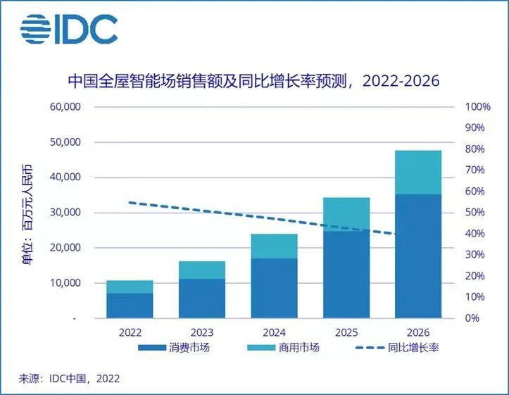 IDC近日发布的行业报告显示,当前中国全屋智能市场在产品、技术、服务能力上均呈现快速发展态势,场景布局不断深入,设备功能逐步升级,连接和交互技术持续演进,渠道体系拓展并完善,服务能力不断强化。IDC预计,2022年中国全屋智能市场销售额将突破100亿元,同比增长54.9%。