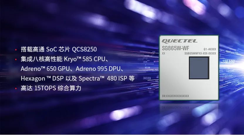 移远通信SG865W-WF智能模组搭载高通SoC芯片QCS8250,该平台采用7nm工艺制程,内部集成八核高性能KryoTM 585 CPU、AdrenoTM 650 GPU、Adreno 995 DPU、Adreno 665 VPU、HexagonTM DSP及SpectraTM 480 ISP 。出色的内部配置为其高达15TOPS的综合算力保驾护航。目前,SG865W-WF的高算力已经覆盖智能摄像头、视频协作、云游戏服务器、智能健身镜、智慧医疗和智慧零售等计算密集型物联网应用,成为诸多智能终端设备算力应用的重要载体。
