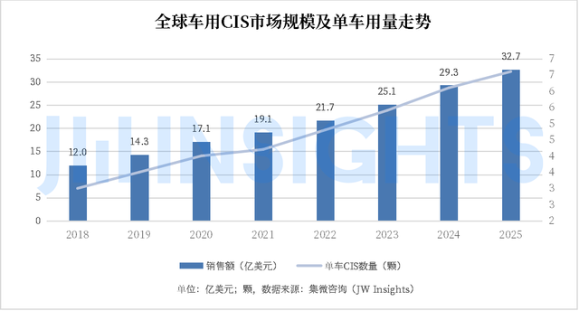 在智能网联汽车和自动驾驶的强力助推下,全球车载CIS的市场需求不断攀升。根据集微咨询(JW Insights)发布的数据,2021年全球汽车电子行业的CIS市场规模约为19.1亿美元,到2025年将增长至32.7亿美元,年复合增速达14.3%。