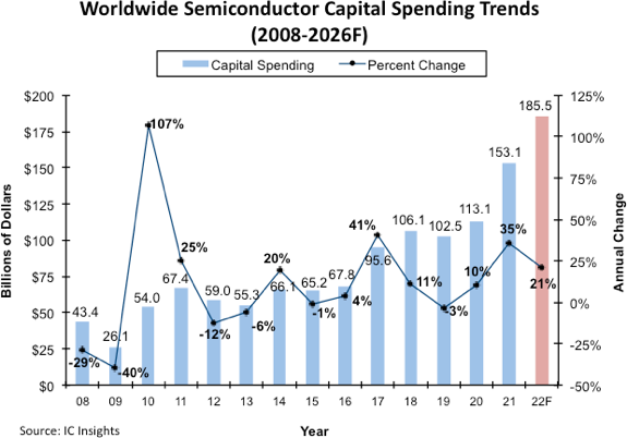 ■ IC Insights:今年全球半导体资本支出将达1855亿美元,同比增24%