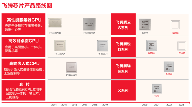 飞腾基于ARM V8架构的永久授权,面向不同的应用领域自主研发了高能效比的FTC6系列、高性能的FTC8系列以及低功耗的FTC3系列3大系列内核,分别应用于桌面产品、服务器产品和嵌入式产品领域。飞腾近期也已经成功研制了新一代8系列高性能处理器核心,性能持续追赶国际先进水平。在开发了多款不同系列的内核后,飞腾根据客户的实际需求,为不同用户提供所需的算力。通过将不同内核类型和数量组合,飞腾目前形成了多个CPU产品线,包括飞腾腾云S系列、飞腾腾锐D系列和飞腾腾珑E系列。同时,飞腾还根据客户需求提出平台化发展战略,推出CPU的配套芯片X100,可配合飞腾系列CPU构成面向场景的、整体化的软硬件一体解决方案,助力用户获取更高的集成度、更高的可靠性、更快的开发进度、更低的成本和更高的国产化率。截至2022年6月底,飞腾的生态伙伴数量已经突破4400家,包括集成商合作伙伴300+家、硬件合作伙伴930家、软件合作伙伴3100+家。