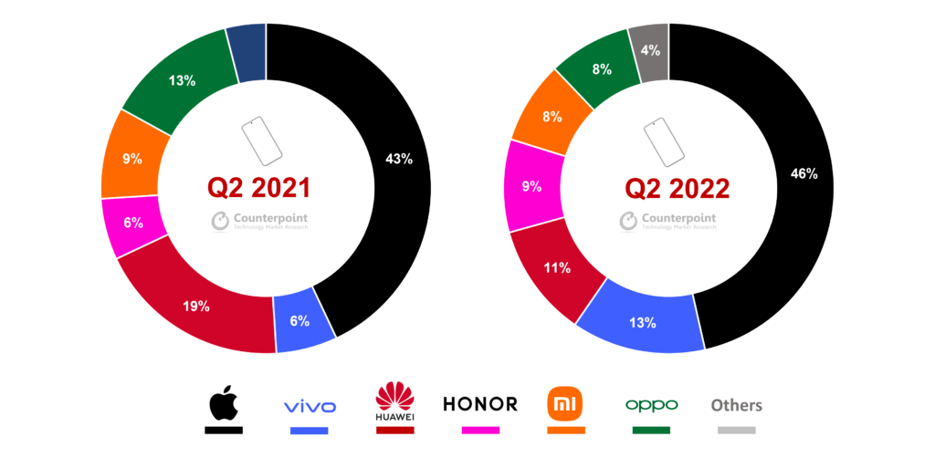 Counterpoint Research 8月24日发布最新销量报告显示,中国高端智能手机市场(批发价人民币2750元及以上)的销量份额从2021年第二季度的31%微升至2022年第二季度的33%。但市场格局上却产生了巨大的变化。对比去年市场份额,苹果从去年的43%增长至46%,而华为则进一步萎缩,从去年排名第二的19%缩减至11%。vivo以13%的份额首次冲上高端市场第二,跃居国产品牌第一,对比去年同期成绩实现了翻倍。