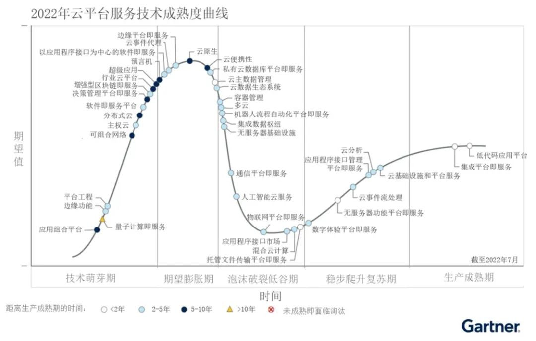 ■ Gartner2022年云平台服务技术成熟度曲线 确定两项技术将在两年内达到生产成熟期