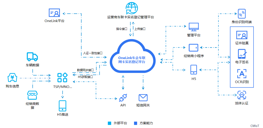 据了解,OneLink车企车联网卡实名登记解决方案,采用线下身份识别终端、线上H5&小程序等多方式进行实名信息采集,提供云服务、私有化、接口服务三大部署模式,面向车企提供整套标准化解决方案。无缝对接运营商T1接口和车企TSP/MNO/MES/DMS等系统,可满足车企、经销商、二手交易商、购车单位、车主对车辆全生命周期的实名登记需求。
