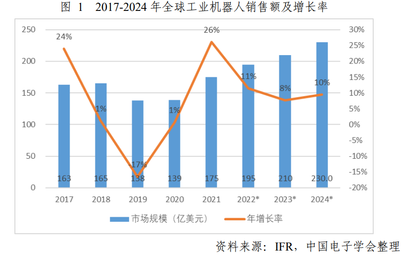 《中国机器人产业发展报告》显示,目前全球及国内机器人产业发展迅速,预计2022年全球机器人市场规模将达到513亿美元,2017至2022年的年均增长率达到14%。其中,工业机器人市场规模将达到195亿美元,服务机器人达到217亿美元,特种机器人超过100亿美元。预计到2024年,全球机器人市场规模将有望突破650亿美元。此外,预计2022年,中国机器人市场规模将达到174亿美元,五年年均增长率达到22%。