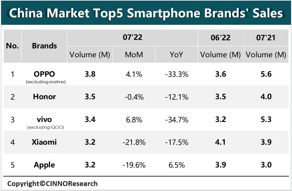■ 7月国内智能手机市场销量同比下降17.7%,OPPO、荣耀、vivo、小米、苹果前五