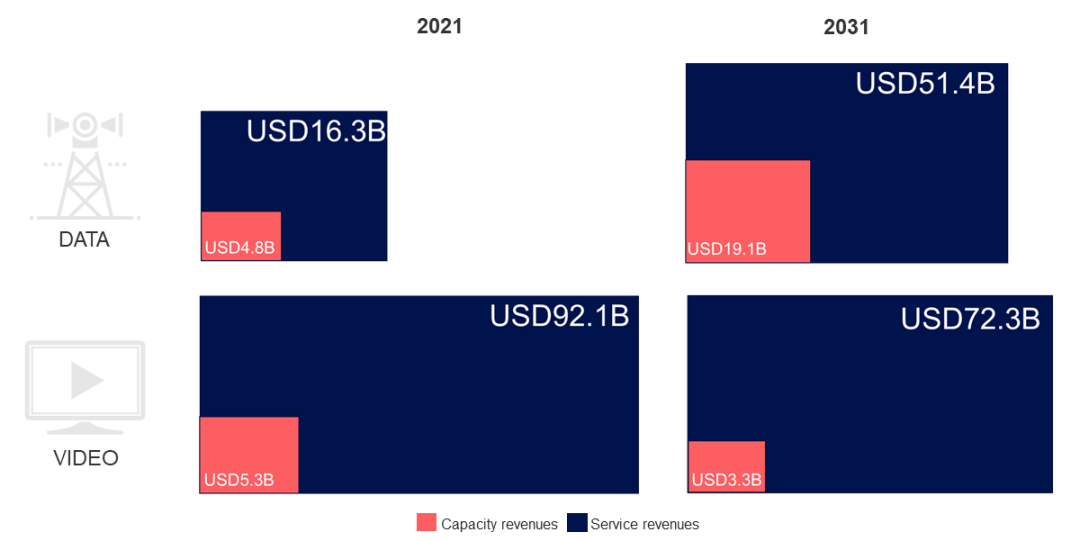 随着华为、苹果等公司相继推出整合卫星通讯能力的高端手机,卫星连接(Satellite Connectivity)市场发展引发关注,研究机构Euroconsult日前发布报告预测,未来星地传输能力有望增长13倍,卫星等硬件能力投资也将从2021年的102亿美元,增长至2031年的224亿美元。在卫星服务收入方面,Euroconsult同样预计在2031年前将看到市场爆发式增长,累积规模有望达到1.2万亿美元,其中数据类应用所占份额将从目前15%,提高到2031年的42%,与数据服务收入激增相反,来自卫星电视等视频服务的收入将呈现下降趋势,预计到2031年卫星收视用户将流失2600万户,8500个卫星电视频道将面临关闭。Euroconsult 还强调了如 OneWeb 等非地球静止轨道卫星 (NGSO) 星座对传统卫星运营商的冲击,尽管芯片供应短缺使大量项目交付延迟,单颗卫星价格也随之走高,但预计该行业2022年卫星投资仍将增长5%,未来几年新的星座大规模部署,将开启新产能供给闸门。