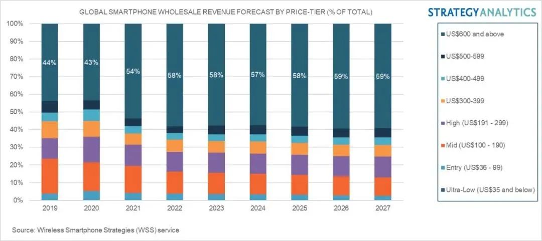 Strategy Analytics无线智能手机战略(WSS)服务的最新发布的研究报告《全球智能手机收益、ASP和价格段预测:2008-2027》指出,全球智能手机批发收益将在2022年同比增长2%,主要受苹果、三星和其他高端机型组合的推动,ASP将同比增长10%。Strategy Analytics预计,从2022年起,高端智能手机(批发价大于300美元)将取代中端手机(100-190美元),成为智能手机销量最高的价格区间。在2022年至2027年期间,高端智能手机市场将占全球智能手机销量份额的33%至36%,并占全球智能手机批发收益份额的73%至75%。在高端智能手机市场中,600美元及以上价格区间将占据高端智能手机最大份额,在2022年至2027年期间,全球智能手机出货量份额将达到21-22%,收益份额为58% - 59%。从出货量和收益来看,300-399美元区间仍将是第二大价格区间。