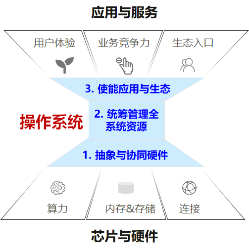 操作系统是软硬件系统的中枢,向上要支持应用与服务,包括提升用户体验、提高业务竞争力、提供生态入口。向下需抽象并管理相关硬件,其核心挑战是如何统筹全系统资源。为解决此挑战,我们可基于系统工程及运筹学的方式思考。类似运筹学研究工厂和作业的管理与调度,操作系统要解决的也是任务如何在硬件上进行管理和调度,主要提供三个关键能力,即:抽象协同芯片硬件,释放硬件能力;统筹管理资源供需,提升全局能效;使能应用高效运行,提供生态入口。