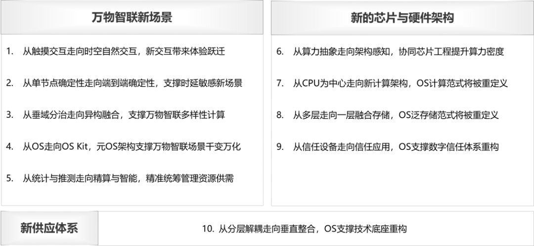 面向 2030,从三大驱动力的视角,提出了操作系统的 10 个演进思考。包括操作系统如何赋能万物智联新场景与新生态,支撑新硬件,构建新的抽象与协同能力等。