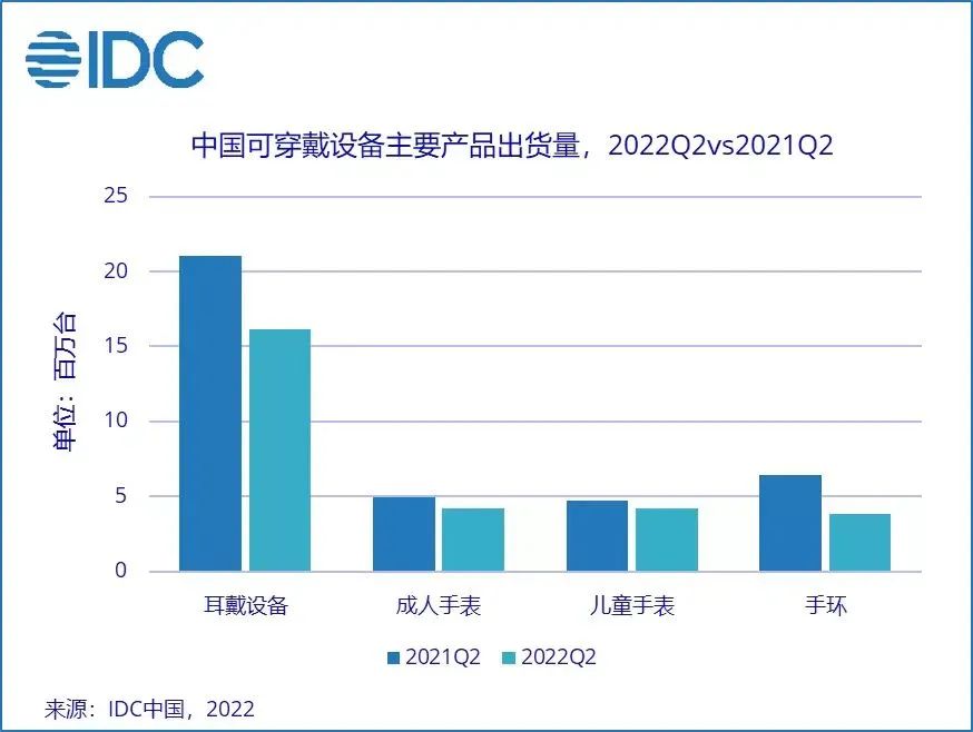 市场研究机构IDC发布的《中国可穿戴设备市场季度跟踪报告,2022年第二季度》显示,2022年第二季度中国可穿戴设备市场出货量2857万台,同比下降23.3%。其中,耳戴设备市场2022年第二季度出货量1618万台,同比下滑23.2%;其中,真无线耳机出货量1273万台,同比下降22.1%。手表市场2022年第二季度出货量846万台,同比下滑12.3%;其中成人手表423万台,同比下降14.5%;儿童手表出货量424万台,同比下降10.0%。手环市场2022年第二季度出货量383万台,同比下降40.2%。