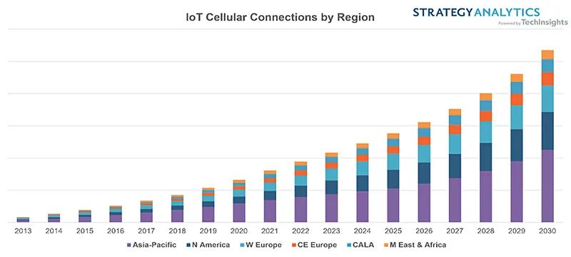 ■ 报告预测,到2030年物联网蜂窝连接仍继续保持两位数增长