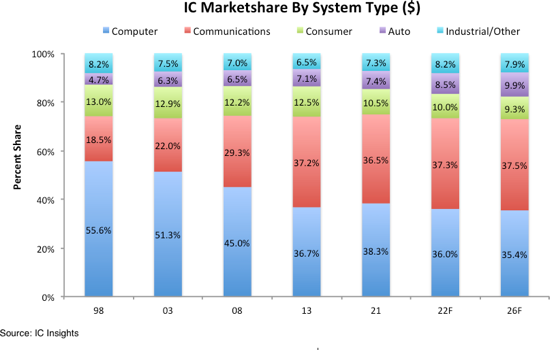 ■ IC Insights:到2026年,车用芯片占比将提升至9.9%