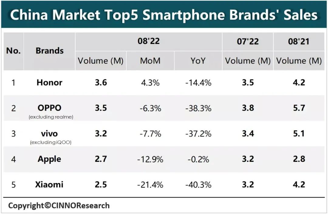 (安迪)市场研究机构CINNO Research发布的数据显示,2022年8月中国大陆市场智能手机销量约为2044万台,较7月销量环比下降7.4%,同比下降26%,环比、同比双降,自今年2月以来已连续第七个月同比负增长,终端市场需求持续低迷,创下2015年以来最差的8月单月销量。从CINNO Research发布的数据来看,2022年8月中国大陆市场智能手机销量排名前五的厂商分别为:荣耀、OPPO、vivo、苹果、小米。荣耀2022年8月在中国大陆市场智能手机销量360万台,同比下降14.4%,环比增长4.3%,今年第三次夺得单月销冠,也是Top5品牌中环比唯一正增长。OPPO 2022年8月在中国大陆市场智能手机销量350万台,同比下降38.3%,环比下降6.3%,排名第二。vivo 2022年8月在中国大陆市场智能手机销量320万台,同比下降37.2%,环比下降7.7%,排名第三。苹果2022年8月在中国大陆市场智能手机销量270万台,同比下降0.2%,环比下降12.9%,排名第四。小米2022年8月在中国大陆市场智能手机销量250万台,同比下降40.3%,环比下降21.4%,排名第五。
