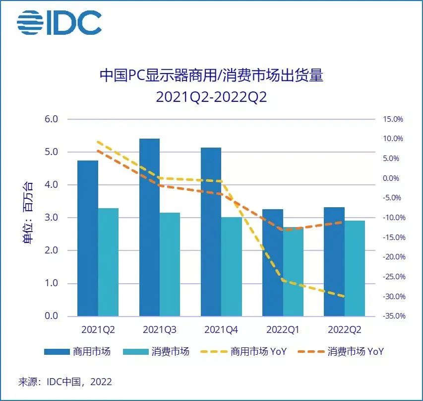 市场研究机构IDC发布的《中国PC显示器市场季度跟踪报告,2022年第二季度》显示,2022年第二季度中国PC显示器出货量624万台,同比下降22.2%。其中,商用市场的PC显示器第二季度出货量332万台,同比下降29.9%。政教订单大幅缩减,政教市场同比下降41.1%;大客户预算缩减,同比下降26.3%;中小企业面临生存压力,同比下降23.5%。因市场需求下降,低价刺激市场作为增长的驱动力也不足够。消费市场的PC显示器第二季度出货量292万台,同比下降11.1%。618年中大促在一定程度上刺激了消费需求,带动了二季度消费市场略有恢复,尤其本土品牌在线上销售保持增长。IDC报告显示,二季度中国市场刷新率≥144Hz的PC显示器出货量103万,同比增长45.6%;曲面显示器市场规模持续收缩,二季度中国曲面PC显示器出货仅有50万台,同比下滑16%,相比历史曲面出货规模最大的2020年二季度下降了近50%。另一方面在曲面主力供应商的努力下,曲面电竞市场规模持续下降了六个季度后,首次迎来增长,二季度增长2.4%。IDC预计,2022年中国PC显示器出货量将下降18.9%。