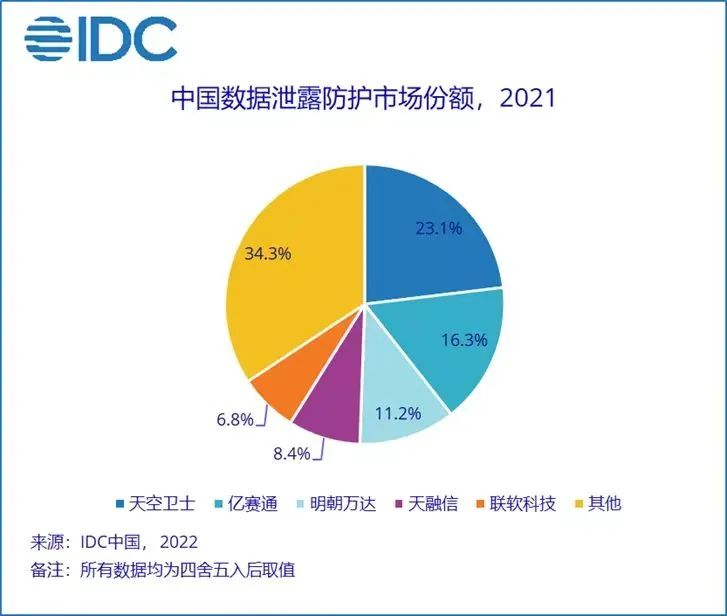 市场研究机构IDC发布的《中国数据泄露防护市场份额,2021:合规驱动与业务需求齐发力,DLP市场重现活力》报告显示,2021年中国数据泄露防护市场规模达到1.25亿美元,同比增长39.2%。该市场头部玩家以专业数据安全技术提供商为主,例如天空卫士、亿赛通、明朝万达等。同时,众多综合网络安全厂商也在该领域持续投入,并获得快速增长。IDC研究发现,技术服务商应重点关注如下趋势:数据泄露防护需要行业化、场景化;自动化、智能化技术正在数据安全产品中广泛应用;用户行为分析提升对数据泄露的主动精准防护;DLP正在融入统一数据安全管理平台;云场景的加入使得数据泄露防护的难度显著加大。