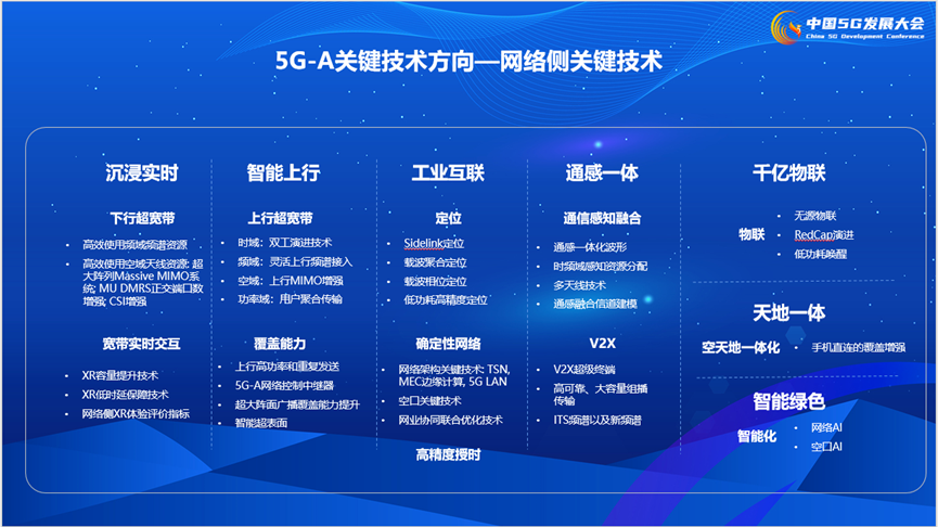 2022年中国5G发展大会上,IMT-2020(5G)推进组发布《5G-Advanced 场景需求与关键技术白皮书》。面向2024年及以后,白皮书提出5G-A总体愿景:万兆泛在体验,千亿智慧联接,超能绿色业态;同时指明5G-A的发展目标:作为基础设施,深化数智社会转型。IMT-2020(5G)推进组5G试验工作组技术专家周吉喆强调:全球5G发展进入5G-A新阶段,通过介绍当前5G-A关键用例的进展,倡议产业界提前做好规划开发,协同发展,促使5G-A进一步落地。