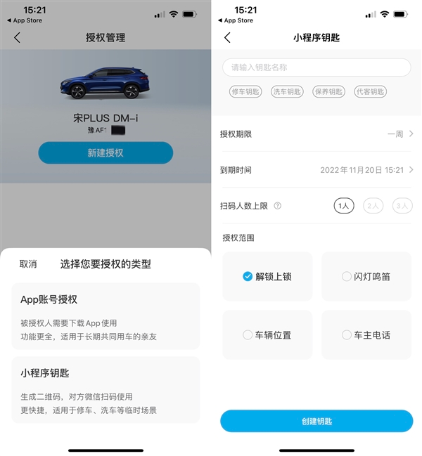 近日,比亚迪汽车APP更新到6.4.0,新增了小程序钥匙授权功能。车主生成授权二维码,被授权用户无需下载APP,微信扫码进入小程序即可使用车辆。同一二维码最多可支持3人扫码绑定,车主可自由设定授权数量; 结束授权绑定后,他人无法再通过该二维码获得授权,保证授权安全。相比APP账号授权,小程序钥匙更快捷,适用于修车、洗车等临时场景。