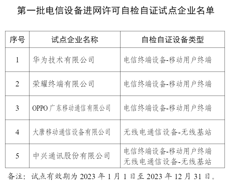 ■ 工信部公布第一批电信设备进网许可自检自证试点企业名单:华为、荣耀等5家入选