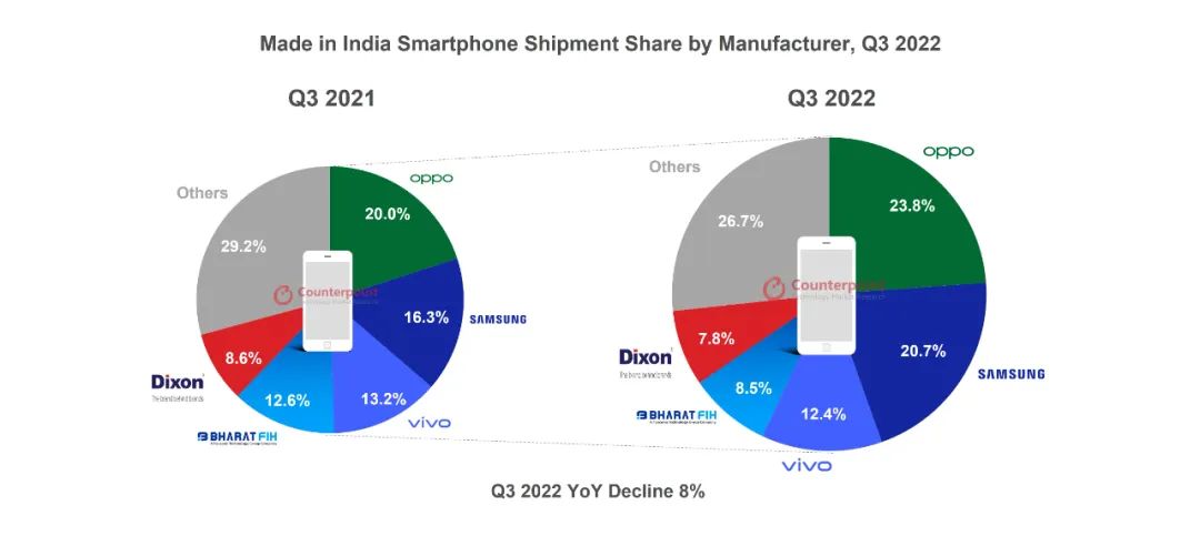 ■ 2022年Q3印度制造智能手机出货量同比下降8%