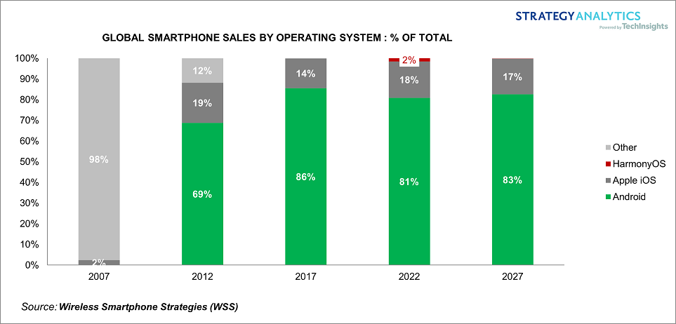 据Strategy Analytics报告显示,预测2023年全球智能手机销量将同比下降5%,同时机构提高了2023年华为鸿蒙操作系统智能手机的销量预测。与研究机构Counterpoint预测全球智能手机市场将在2023年同比增长2%不同,SA看淡明年的智能手机市场。在今年各种因素影响下,消费者对新智能手机设备的需求进一步减弱。与2022年6月的预测相比,SA提高了2023年华为鸿蒙操作系统智能手机的销量预测。SA解释到,华为4G产品组合稳定了其全球业绩,其在中国国内市场的表现超出了SA的预期,故认为,2022年华为鸿蒙HarmonyOS手机全球份额将达2%。Strategy Analytics预计三星和苹果将保持前两名的市场份额。同时,该报告降低了对苹果iOS系统的销售预测数字,主要是苹果产品的制造供应链出现了剧烈波动。2022年iOS手机份额将为18%,2027年这一份额将为17%。预测期内安卓仍将是全球市场上最大的智能手机操作系统,份额约为80%。苹果iOS将获得稳健的增长,受益于华为在高端市场衰落以及传统设备和新SE设备对低价格段的渗透。