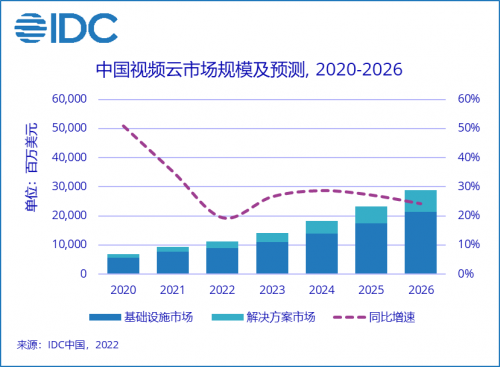12月27日,IDC发布的《中国视频云市场跟踪(2022上半年)》报告了解到,腾讯云音视频的解决方案市场份额连续多年排名第一,稳居领跑者地位。报告显示,2022上半年中国视频云市场规模达到50.5亿美元,其中视频云解决方案市场规模达10.5亿美元,同比增长达到28.7%。报告分析称,随着传统行业客户比例不断提高,诸如媒资管理、轻量化内容生产、客户触达以及面向传统行业的远程视频连接等场景和需求,正在成为视频云市场的“新动能”。
