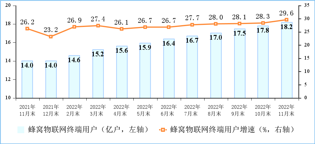 近日,工信部公布了《2022年1-10月份通信业经济运行情况》。报告指出,我国“物超人”步伐持续加大,IPTV用户稳步增长。截至11月末,三家基础电信企业发展蜂窝物联网终端用户18.18亿户,比上年末净增4.21亿户;已超移动电话用户数1.34亿户,占移动网终端连接数(包括移动电话用户和蜂窝物联网终端用户)的比重达51.9%。IPTV(网络电视)总用户数达3.76亿户,比上年末净增2705万户。截止2021年底,我国蜂窝物联网用户为14.03亿户,移动电话用户为16.42亿户,差距2.39亿户。蜂窝物联网用户相比移动电话用户接近10倍的增长速度,使得双方差距在进入2022年后迅速缩小,截止2022年8月底,历史性实现了“物超人”的壮举,蜂窝物联网用户达到16.98亿户,超过移动电话的16.78亿用户,并开始不断拉大差距。