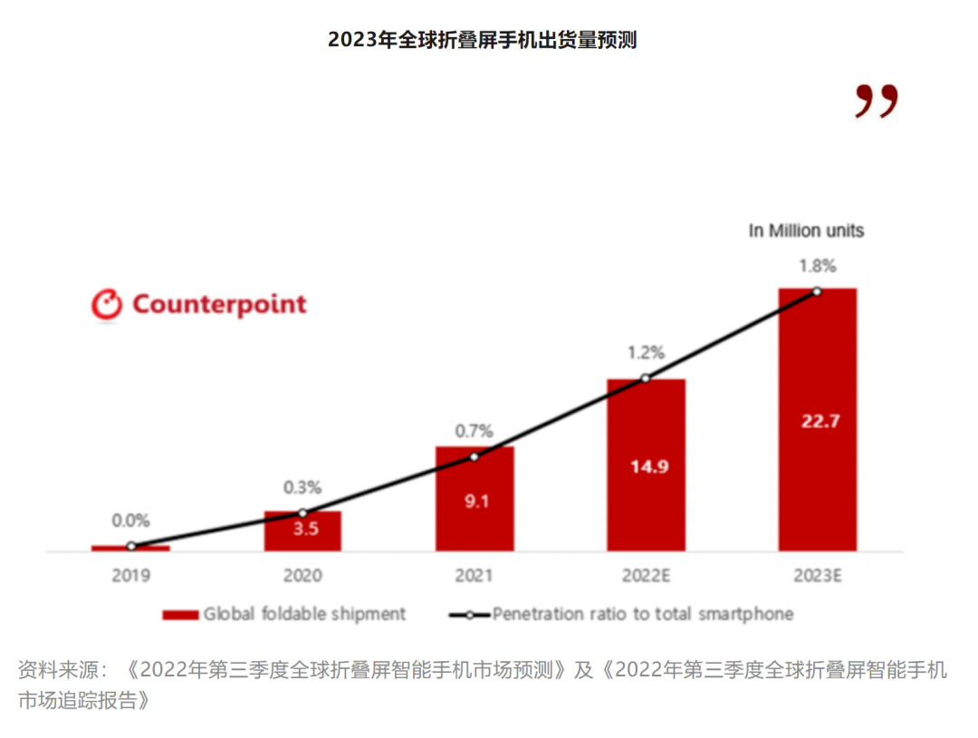 ■ 预计2023年全球折叠屏手机市场同比增长52%,达到2270万部