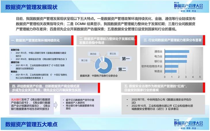 2023年1月4日,在第五届“数据资产管理大会”上,《数据资产管理实践白皮书(6.0版)》正式发布。白皮书总结了数据资产管理活动职能的核心理念与实践要点,提出了战略规划、组织架构、制度体系、平台工具、长效机制五大数据资产管理保障措施,提倡企业体系化开展数据资产管理工作,提升数据资源化效率,创新数据资产化模式,引导企业充分融入数据要素市场发展,加速数据资产价值释放。未来,数据资产管理将朝着统一化、专业化、敏捷化的方向发展,提高数据资产管理效率,主动赋能业务,推动数据资产安全有序流通,持续运营数据资产,充分发挥数据资产的经济价值和社会价值。