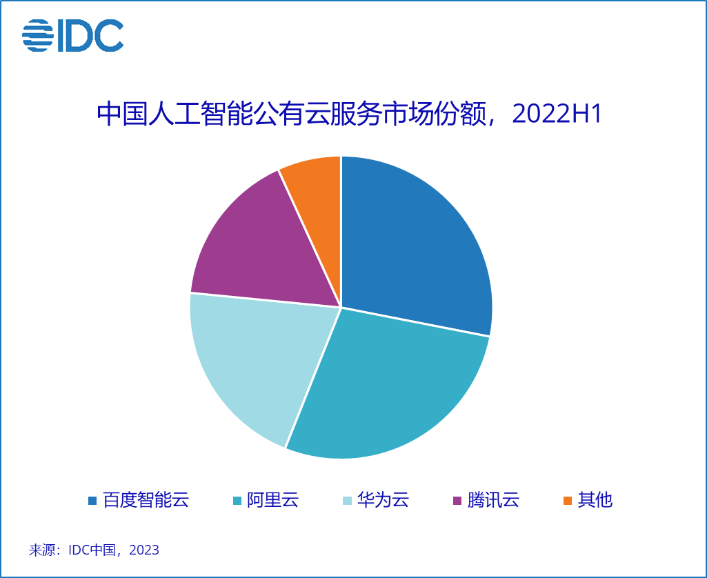 据IDC预测,2022年中国AI公有云服务市场规模将达74.6亿元人民币,占AI软件整体市场的16.5%,较2021年呈上升趋势。从年度增速的角度来看,基于云计算的AI能力逐渐得到验证、企业上云率和云原生企业占比逐渐提高、混合云技术日益成熟和普及等驱动AI公有云部署方式快速增长,增速远超AI软件整体市场增速。但由于中国市场对数据安全、个人隐私保护等有一定的要求,私有化部署在未来几年仍将是主流。在人工智能整体市场,受到技术的突破的影响格局变化较大,但AI公有云服务厂商市场格局相对稳定,2022上半年百度智能云仍然位居第一,阿里云位居第二与第一差距逐渐缩小,华为云、腾讯云市场份额不断上升。