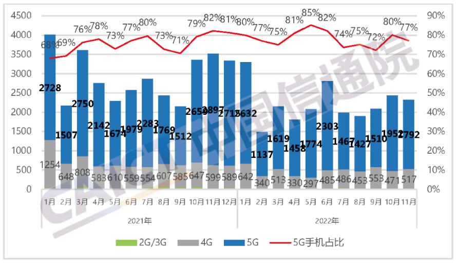 根据中国信通院发布的《2022年11月国内手机市场运行分析报告》,2022年11月,国内市场手机出货量2323.8万部,同比下降34.1%,其中,5G手机1792.0万部,同比下降38.1%,占同期手机出货量的77.1%。