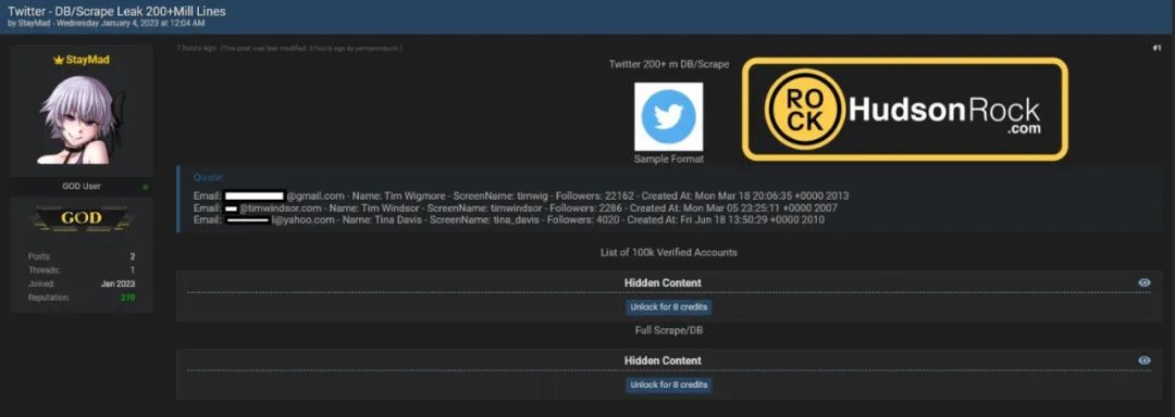 有黑客在论坛上泄露了含有 2.35 亿推特用户的数据。援引 Cybernews 报道,此次泄露的数据大约有 63GB,其中包括用户的姓名、电子邮件地址、粉丝数量和账户创建日期。该数据库甚至是公开的,允许任何人下载它。据悉,这些记录很可能是在 2021 年底利用 Twitter 的一个漏洞泄露的,该漏洞允许掌握电子邮件地址或电话号码的外人在 Twitter 上找到任何与该信息相匹配的账户。这些查询可以自动化,以检查无限数量的电话号码和电子邮件地址。