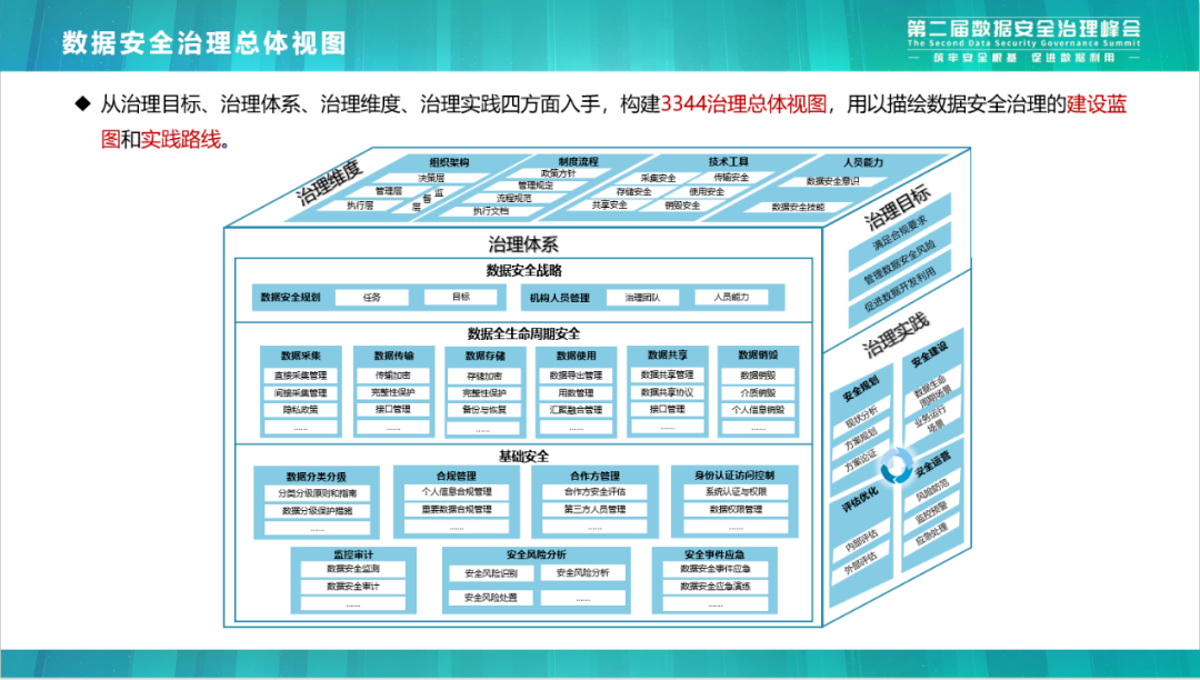 2023年1月5日,在第二届数据安全治理峰会上,《数据安全治理实践指南(2.0)》正式发布。《指南(2.0)》依据大量行业调研和企业实践,在《指南(1.0)》的基础上优化了数据安全治理总体视图,并针对数据分类分级难落地、管理与技术易脱钩等焦点问题的建设方案进行了初步探索,进一步细化了数据安全治理实践路线。《指南(2.0)》在三方面进行了优化升级。一是提出3344数据安全治理总体视图,即3项治理目标、3层治理体系、4项治理维度、4步实践路线。二是提出全新数据安全治理理念,优化规划-建设-运营-优化的数据安全治理实践路线;三是提出数据分类分级7步建设路线。更加切合企业数据安全治理建设实际需要,同时也分析了企业数据安全治理最为关注的热点问题。《指南2.0》延续了对数据安全治理概念的理解,从组织内部来看,数据安全治理是指在组织数据安全战略的指导下,为确保组织数据处于有效保护和合法利用的状态,以及具备保障持续安全状态的能力,内外部相关方协作实施的一系列活动集合。由此,梳理出数据安全治理的三个要点:一是“以数据为中心”,二是“多元化主体共同参与”,三是“兼顾发展与安全”。