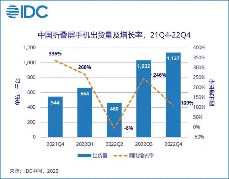 市场研究机构IDC最新发布的手机季度跟踪报告显示,2022年第四季度,中国折叠屏产品单季出货量再创新高,出货超过110万台;2022年全年,中国市场折叠屏手机产品全年出货量近330万台,同比增长118%,增速高于预期。折叠屏产品在国内智能机市场中占比从2021年的0.5%上升到1.2%。市场格局来看,2022年全年,华为牢牢占据国内折叠屏市场第一的位置,市场份额达47.4%,优势明显;三星排名位居第二位,占据16.5%的市场份额;凭借Find N系列的全年稳定表现,OPPO获得13.8%的市场份额,排名第三,虽然Find N2& Flip临近年末才上市,但首销情况超过上一代产品;第一款折叠屏产品X Fold&+系列帮助vivo在折叠屏市场稳定在第四位,市场份额7.7%;荣耀和小米分别位居第五和第六位,份额接近;联想只有一款竖折Razr系列排名第七。