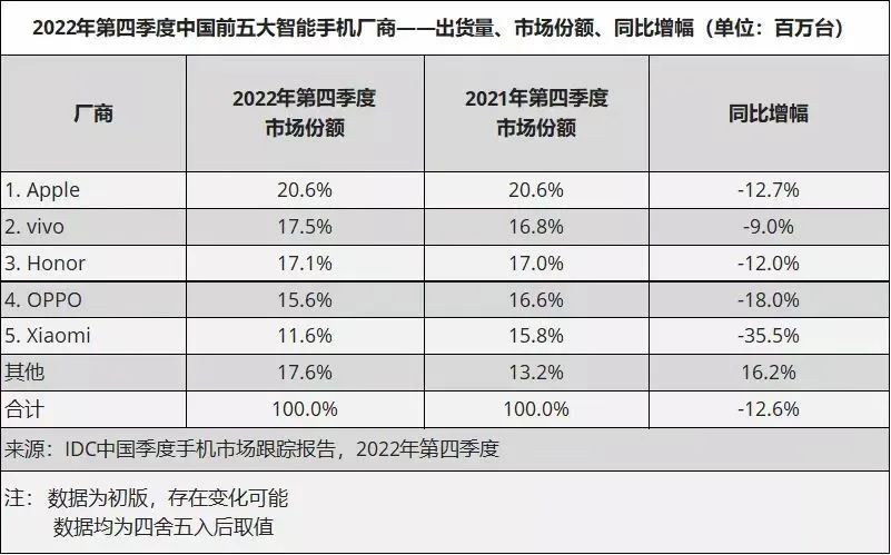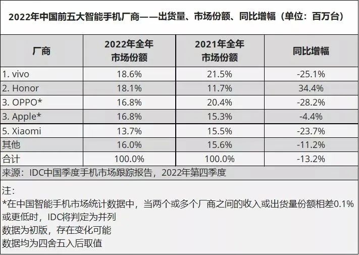 ■IDC:2022年中国智能手机市场出货量同比下降13.2%:vivo第一 小米降至第五