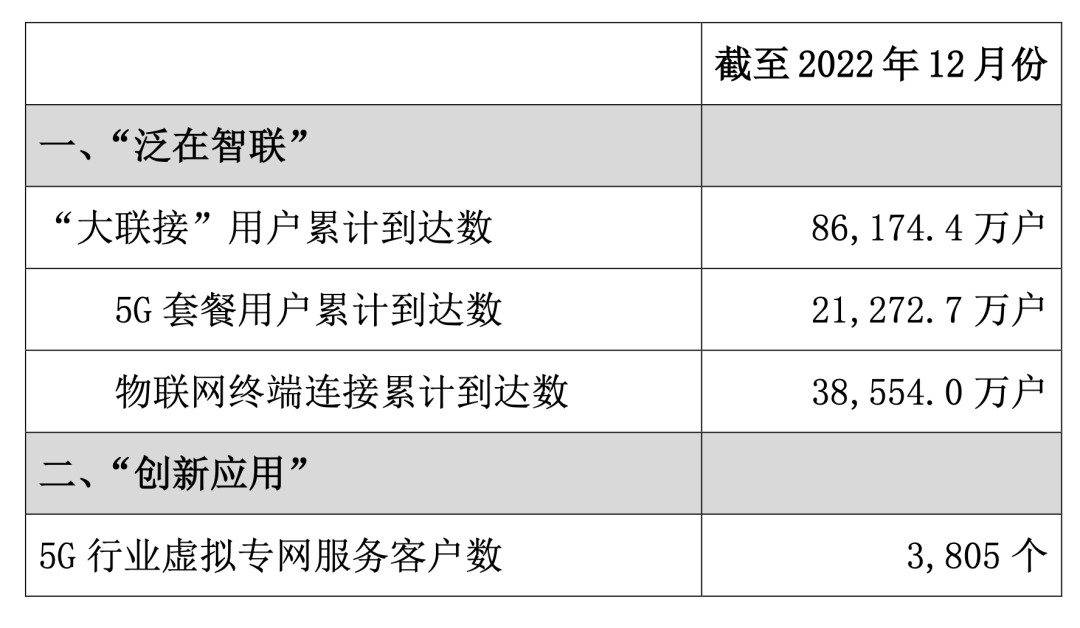 “泛在智联”方面,截至2022年12月,中国联通“大联接”用户累计达到86174.4万户,其中5G套餐用户累计达到21272.7户,物联网终端连接累计达到38554.0万户。截至2022年11月,5G套餐用户累计达到20945.6万户,物联网终端连接累计达到37640.8万户。这也意味着,中国联通12月5G套餐用户和物联网终端连接数新增数量分别为327.1万户和913.2万户。